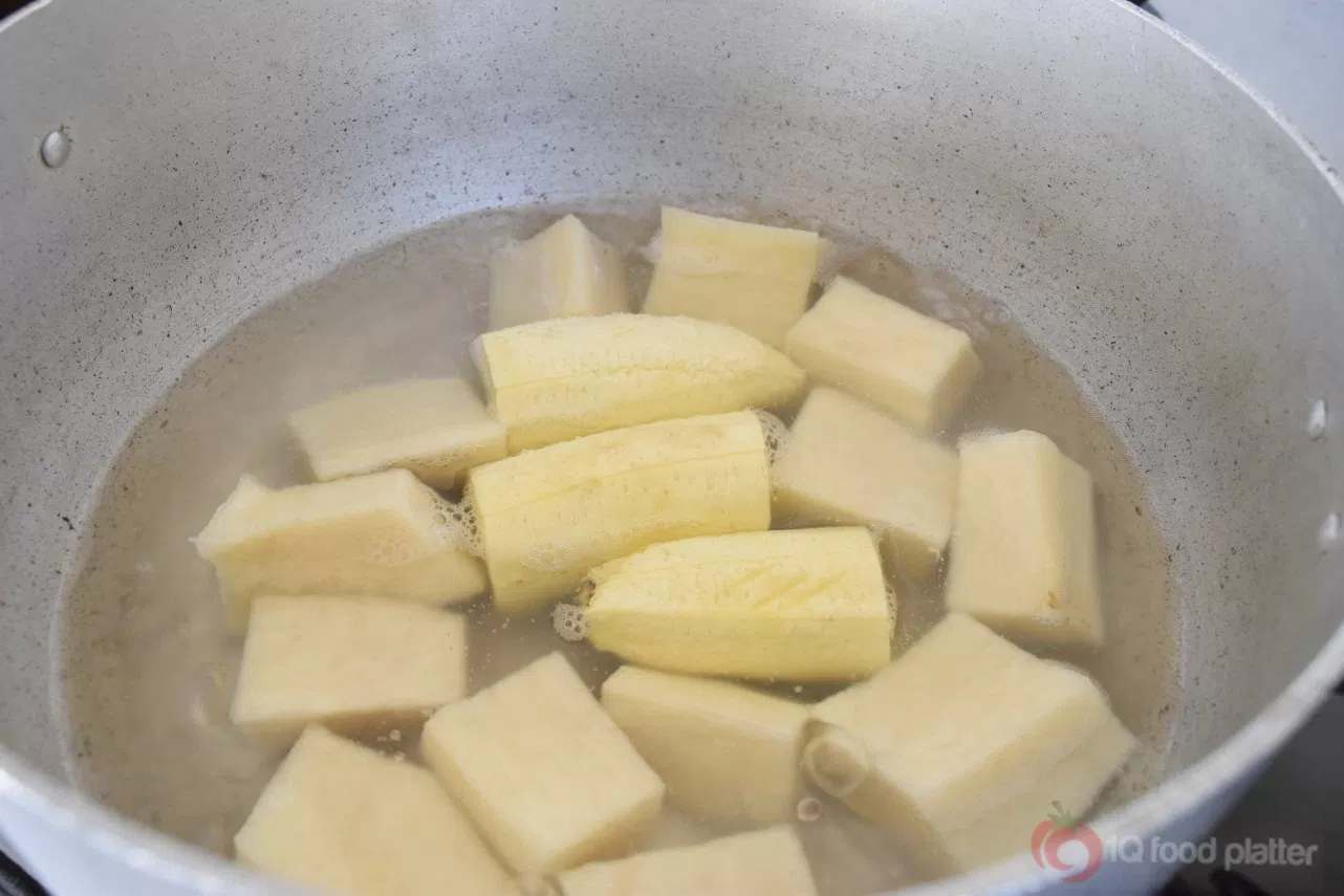 2. Peel the plantain, cut into 3 pieces and add to the yam after that has been boiling for about 5 minutes