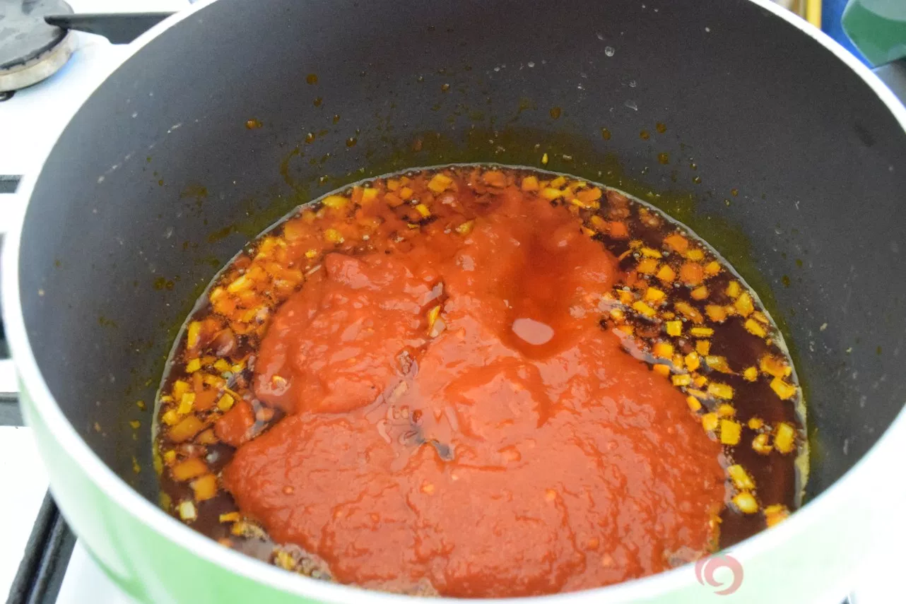 4. Add the tomato/ pepper mix and fry for about 5 minutes.