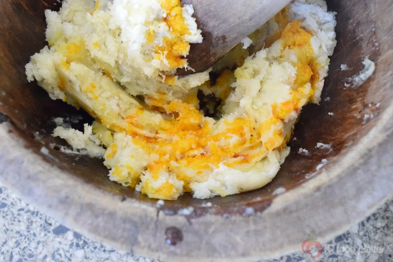 4. Cook both till soft and pound adding the palm oil . Pound till yam, plantain and oil is well mixed. Mould into small balls.